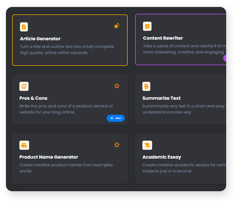 Generador de artículos Mejorador de contenido Contenidos del blog Creaciones de anuncios Texto a voz ¡Y muchos más!